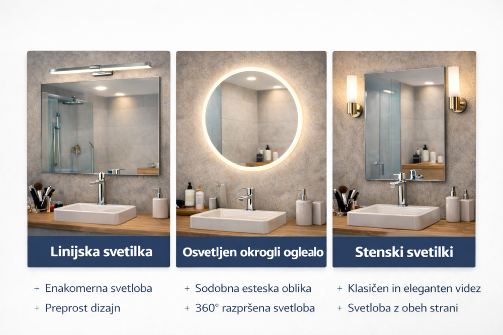 V sodobnih kopalnicah z ravnimi linijami in nevtralnimi barvami se najbolje obnesejo tanka linijska LED svetila, pogosto v črni, beli ali kromirani izvedbi. Takšna luč deluje diskretno, hkrati pa elegantno poudari ogledalo. V bolj klasičnih kopalnicah pa so pogosta izbira svetila z mehkejšimi oblikami in toplejšim videzom, ki prostor naredijo bolj domač.